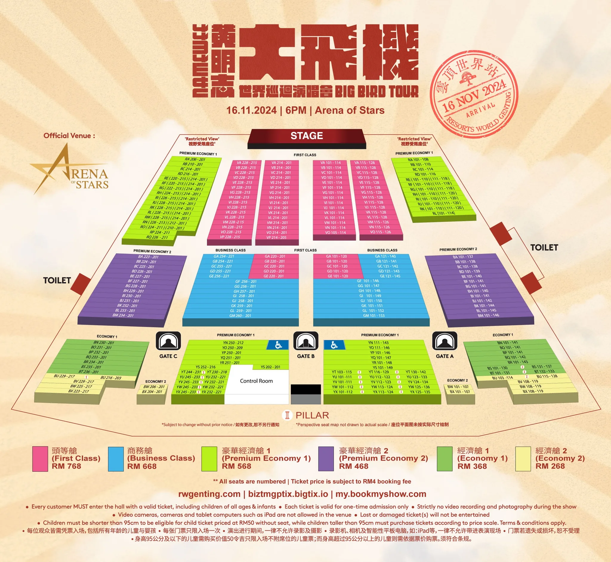 - Ticketing: RM768(头等舱First Class)| RM668(商务舱Business Class)| RM568(豪华经济舱1 Premium Economy 1)| RM468(豪华经济舱2 Premium Economy 2)| RM368(经济舱1 Economy 1)| RM268(经济舱2 Economy 2)