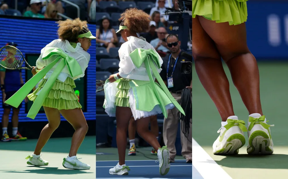 Naomi has already publicly showcased the green version of the uniform, which featured ruffles along the sides and the back of the dress. The kit also includes a warm-up jacket, which made waves with its giant green bow, and the warm-up skirt, which incorporates tulles to emulate a tutu. Her custom Nike sneakers completed the look, with heels decorated with green bows.