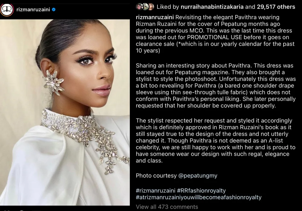 “This dress was loaned out for Pepatung Magazine. They also brought a stylist for the shoot. Unfortunately, this dress was a bit too revealing for Pavithra (a bared one shoulder drape sleeve using thin see-through tulle fabric) which does not conform with Pavithra’s personal liking. She later personally requested that her shoulder be covered up properly,” they revealed in the post.