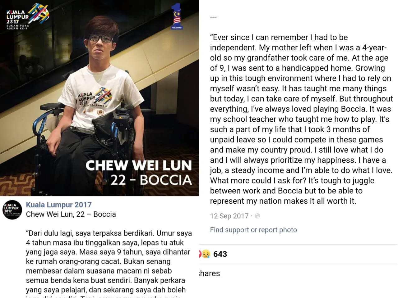 From living a challenging life to becoming a Paralympian, 26-year-old Chew Wei Lun has certainly marked a remarkable history in his Boccia career. Beneath his success, the Johor-born athlete kept a hidden story that was unknown to many. His tough upbringing resurfaces following his success and it certainly touched the hearts of many Malaysians who follow his journey.
