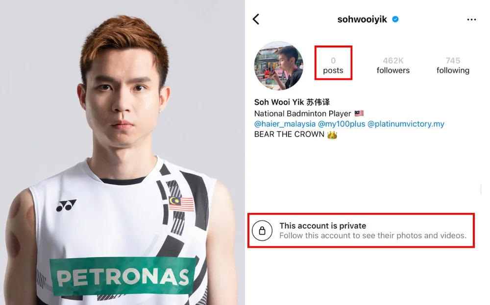 According to news reports, the athlete suddenly deleted all posts from his personal Instagram account on 22nd December (Sunday). Soh Wooi Yik, who has over 460,000 followers on the platform, also made his account private, meaning it is no longer viewable to non-followers. In addition to locking his Instagram account, the Olympic bronze medalist also made his personal Twitter private on the same day.