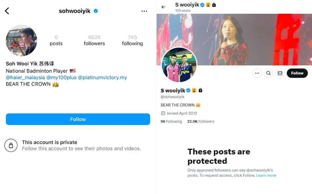 However, the athlete’s official Facebook page remains open to the public, with all its posts still on the page. As of writing, Soh Wooi Yik’s Instagram and Twitter accounts remain private, and the 26-year-old has yet to address the matter. His men’s doubles partner, Aaron Chia, has also stayed silent on the issue. Nevertheless, Soh Wooi Yik’s actions have sparked concerns and prompted many fans to speculate about the potential reasons for the sudden move.