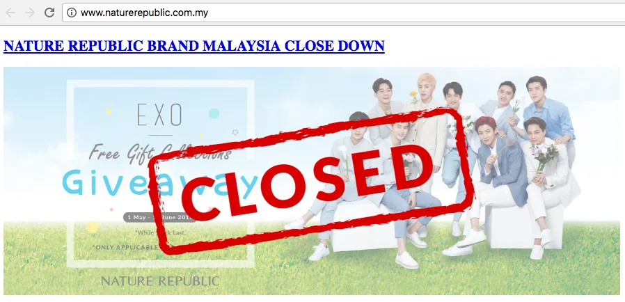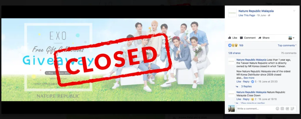 Nature Republic (네이처리퍼블릭) Malaysia took to their Facebook page to announce that they’re closing. The brand uploaded a new cover photo that has an angry, red “CLOSED” stamped across an image of their brand ambassador, K-Pop idol boy group EXO.