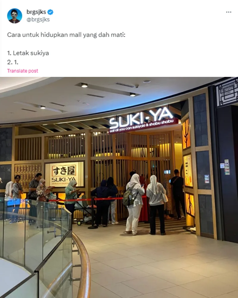 Twitter user @/brgsjks first started the discourse when he posted, “The way to revive a dead mall: 1. Put a Suki-ya. 2. 1.” with a photo of a Suki-ya branch with a sizable crowd of people queuing to enter the restaurant. The tweet referenced the recent hype about the shabu-shabu restaurant that got many people queuing for hours just for a taste. The suggestion had many netizens in agreement, even hoping for their neighbourhood mall to take note.