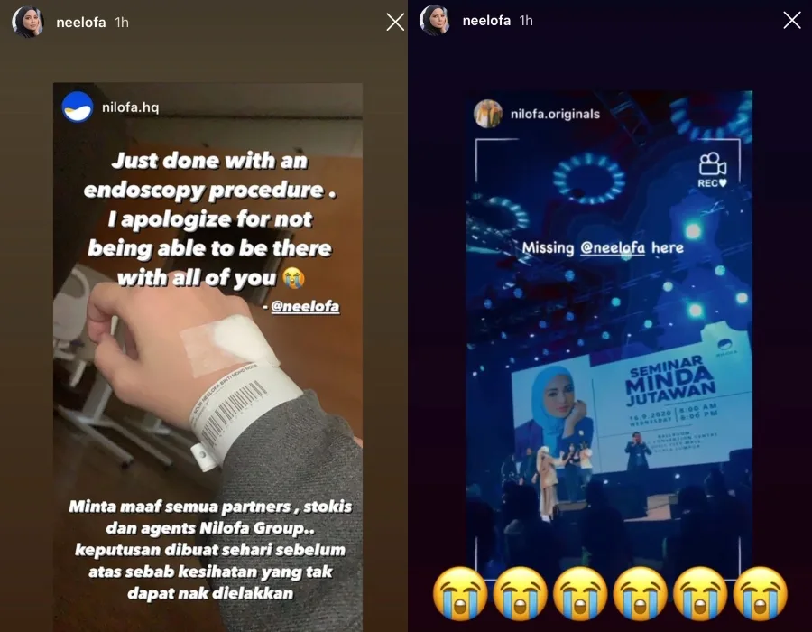 “Just done with an endoscopy procedure. I apologise for not being able to be there with all of you,” wrote the 31-year-old starlet. “Sorry to all partners, stockists as well as agents of Nilofa Group. The decision was made the day before (the event) due to unavoidable health reasons,” Neelofa announced on her Instagram Story.