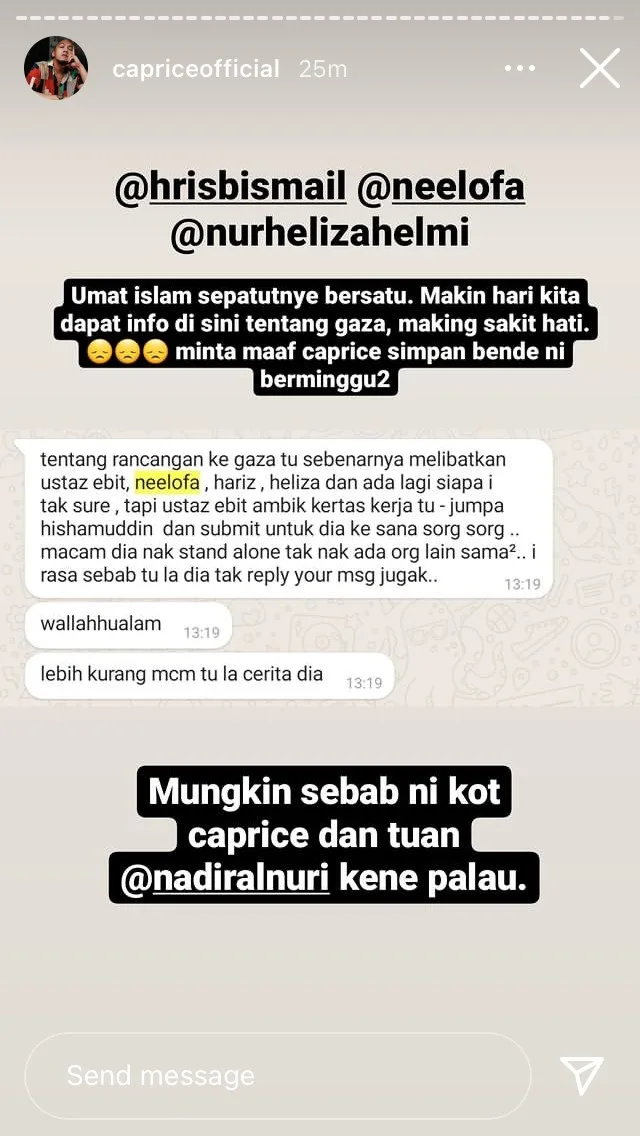 For the uninitiated, the drama involving the aforementioned figures started after Caprice (real name Ariz Ramli) posted a screenshot of a conversation on his IG Story, claiming that Ebit took the humanitarian mission proposal to Gaza, which was done by the celebrity couple and another activist, Heliza Helmi.