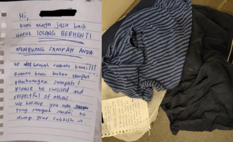 The argument sparked when a resident sent a note, along with a discarded boxer briefs, to the neighbour who lives upstairs. The note reads, “Hi (tenant’s name), we ask for your kind consideration to stop dumping your garbage at us. Our house is not a garbage dump, so please be more civilised and be respectful towards others. We believe you have your own bin to dump your rubbish in.”