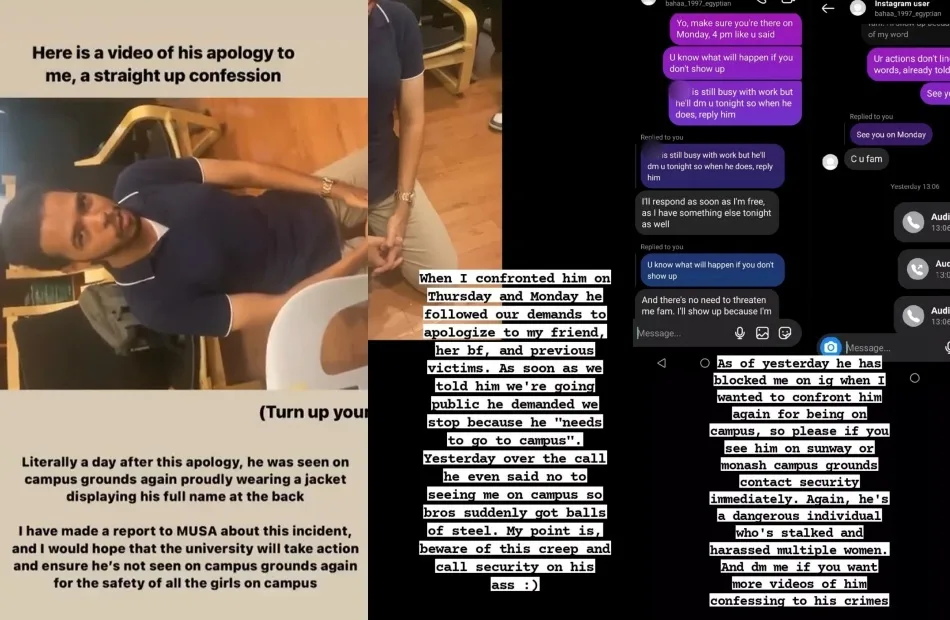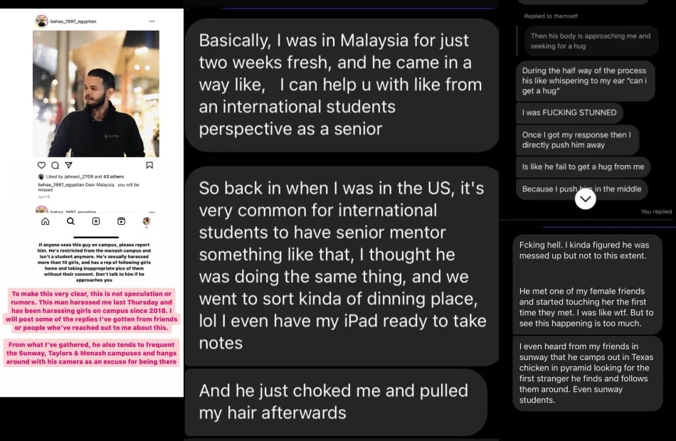 Unfortunately, even when confronted, the foreign man still has not changed his ways despite apologising for his behaviour as seen in the screenshots below. It was said that the pervert still frequents other universities in disguise to look for potential victims. According to @aphyyxia, Monash University has yet to take any action against Bahaa.