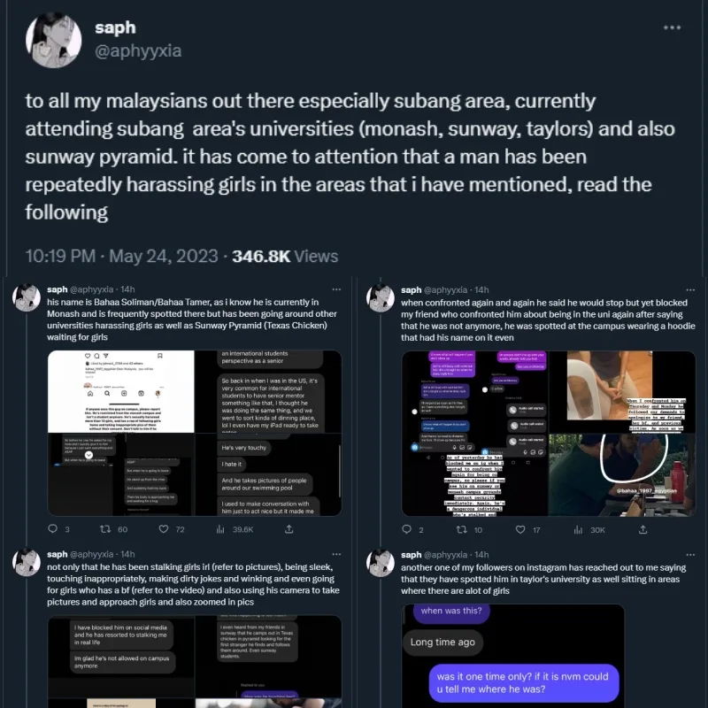 @aphyyxia ended her thread by stating that she along with the victims will file a police report against Bahaa once they gathered enough evidence of his crimes. In the meantime, the Twitter user urged all victims to come forward or DM her if they were harassed by the foreign student.