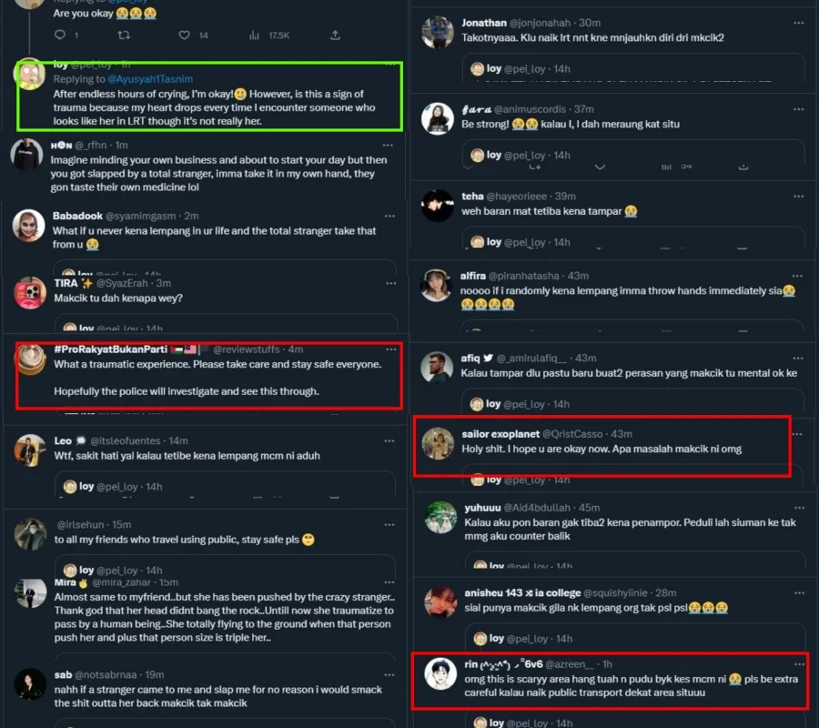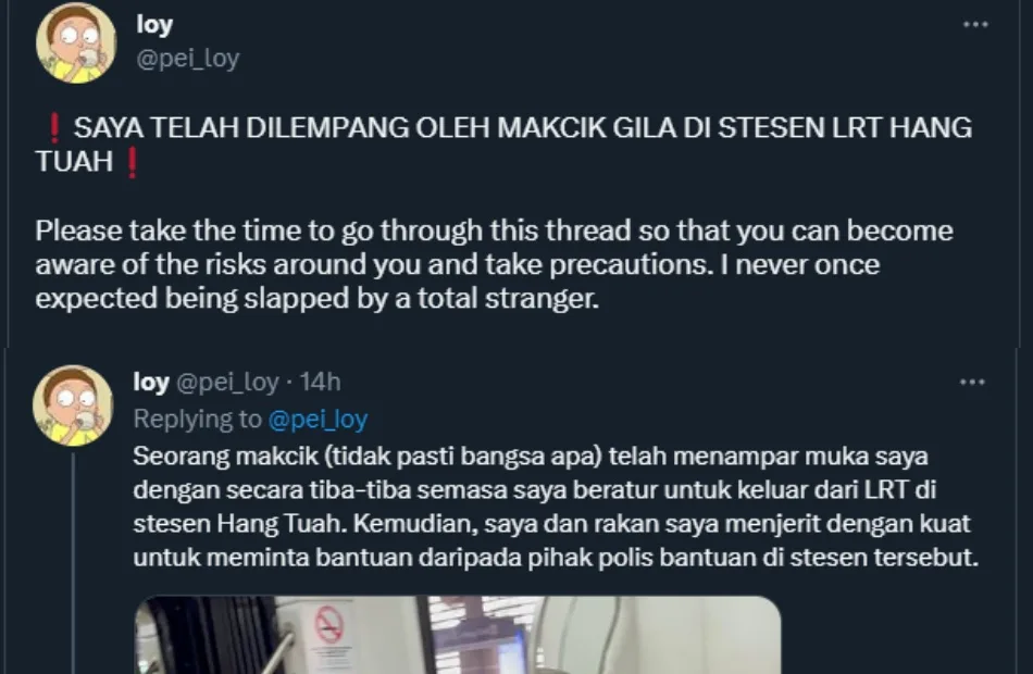 Taking to Twitter, a netizen who goes by the username pei_loy or Loy shared the story in a thread of how she was physically assaulted by a strange woman. According to the tweet, the incident took place at the Hang Tuah LRT station. “I never once expected [to be] slapped by a total stranger,” she tweeted.