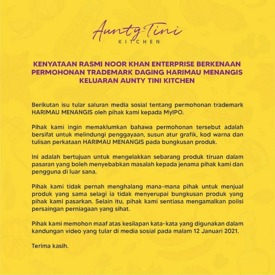 After facing massive backlash from social media users, Kartini’s team released an official statement on their Instagram, @auntytinikitchen to clear the air on the controversy. In this case, they clarified that the application was made for the purpose of “protecting the styling, graphic layout, colour code and the word on the product’s package”. They further added that the action was made in order to avoid confusion among consumers of their products out there.
