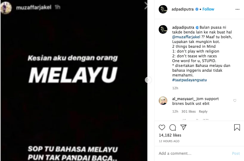 “Is there nothing else to do during the fasting month @muzaffarjakel?? We can accept your apology, but it will be difficult for us to forget (what you’ve done). There are 2 things to bear in mind; Don’t play with religion and don’t tease with races. One word for you, STUPID. Bahasa Melayu translation is included in case you don’t understand English,” Adi captioned the post.
