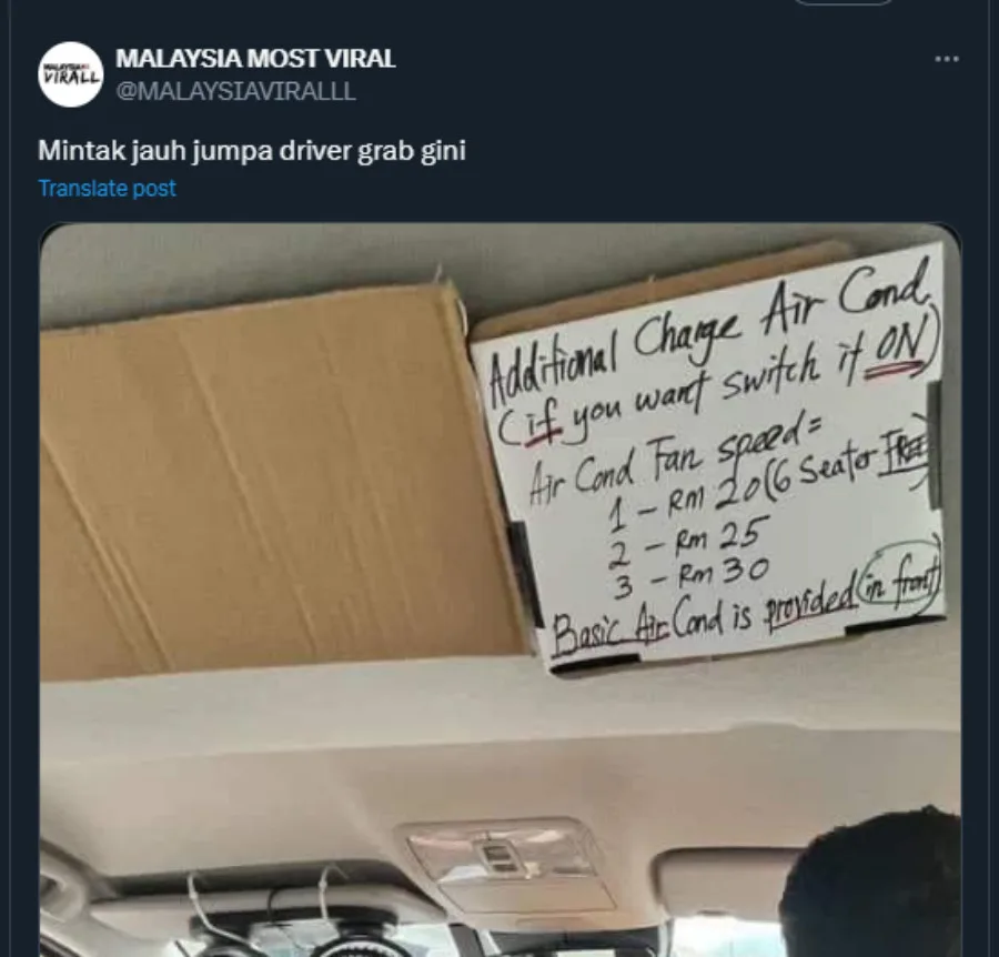 According to the note, customers would need to pay for the air-conditioning to be switched on, as the driver will only direct the air-conditioning in the front towards himself. Customers would be charged RM20 for level one, RM25 for level two, and RM30 for level three. As expected, the post quickly went viral and netizens were flabbergasted by the driver’s unreasonable charges.