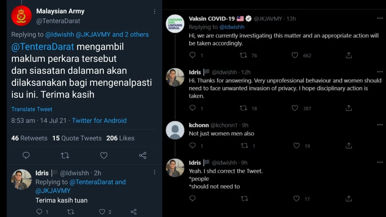 Another user replied under Idris’s post commented that her sister was also approached by the same man, who is a member of the Malaysian Armed Forces (ATM). “Same thing happened to my sister! He took advantage by escorting those who (seemed) lost, then (verifying their) second dose vaccine while he got their phone number,” she remarked.