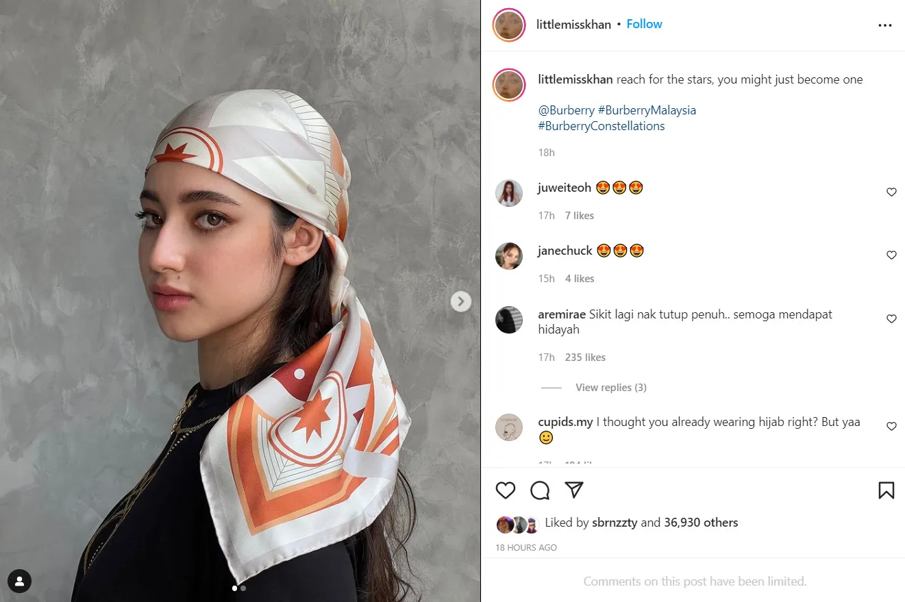 Ameera, who’s also the younger sister to local celebrity Neelofa, once again sparked a frenzy on social media after she shared a photo of herself rocking head-to-toe outfits from Burberry. In the photos, she was also seen covering her hair with only a piece of bandana, instead of the typical scarf.