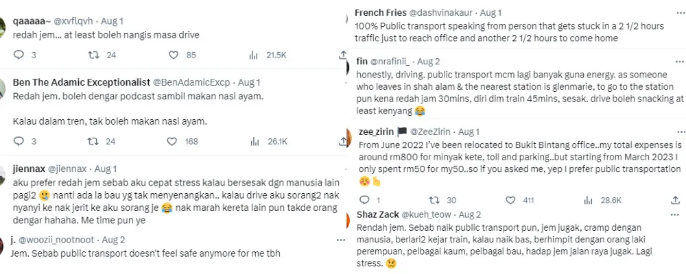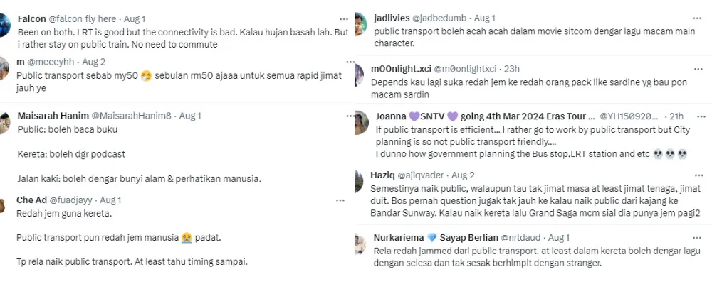 Those who favoured public transportation mostly said they preferred it for its low monthly cost because they only pay RM50 per month for unlimited rides with the My50 pass. Some also added that public transportation gives you the freedom to do things because you’re not the one driving, even joking that it’s like being the main character in a movie. One netizen added that trains would get you to your destination on time because it follows a schedule.