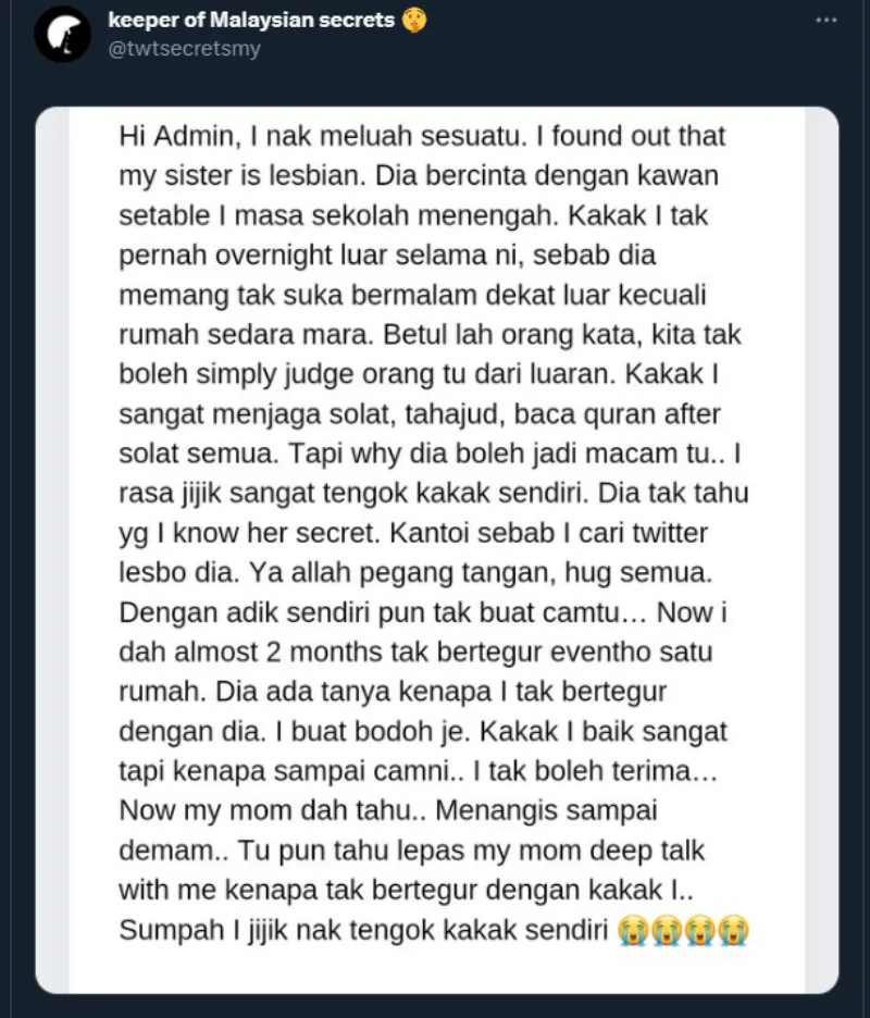 Over the weekend, an anonymous Twitter user submitted a confession to the Keeper of Malaysian Secrets page where they detailed how they suspected that their older sister may be a lesbian. In her submission, the user explained that she found out about it after looking up her sister’s secret Twitter account. She added that there were photos of her sister being suspiciously “intimate” with a friend; holding hands and cuddling.