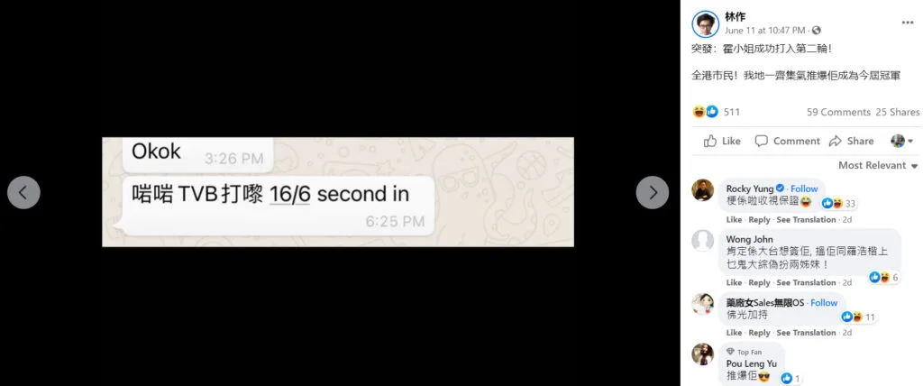 Candidate Kirsten Li (霍韻璇) informed her nominator Lin Zuo (林作) that she had been selected for the second round of interviews. He then happily announced the news on Facebook, posting a screenshot of her message. “Breaking News: Miss Huo has successfully entered the second round! (To) all the citizens of Hong Kong! We’re all going to be the champion of the year!” he wrote in his post.
