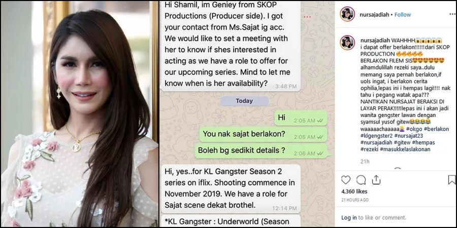 In her Instagram post, she shared with her fans the good news by posting a screenshot of a WhatsApp conversation between her manager and a representative from the “Gerak Khas“ filming team. In the conversation, it was revealed that Sajat has been offered a scene in a brothel.