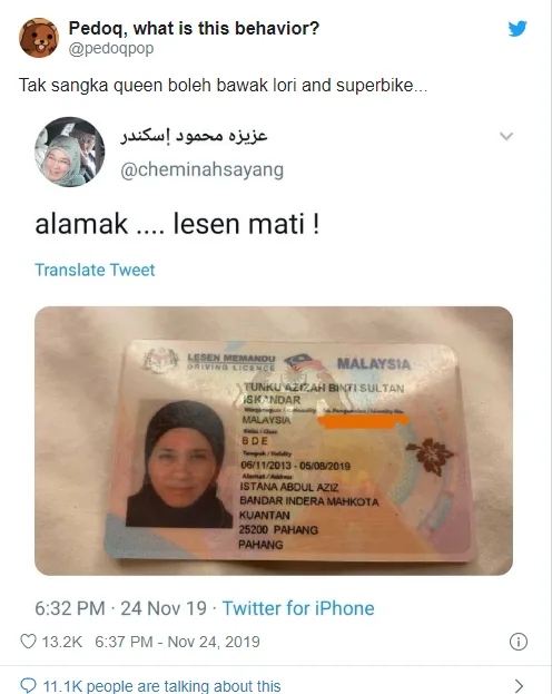 Recently, Tunku Azizah uploaded a photo of her driving license, along with the caption, “Oh dear …. my license died!”.