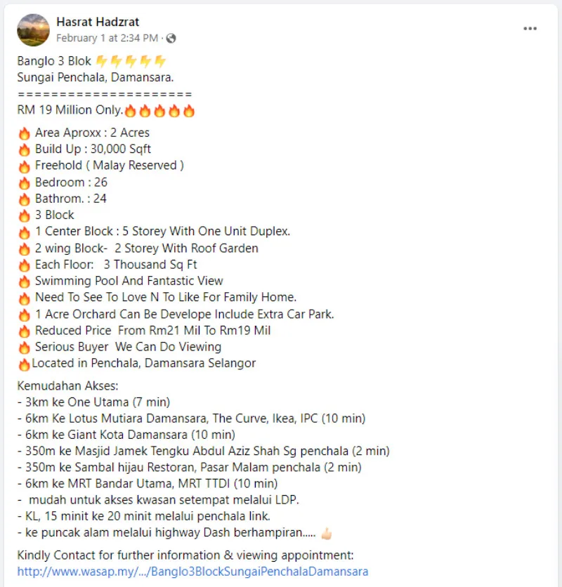 Real estate agent Hasrat Hadzrat recently posted on their Facebook page about a house that’s currently up for sale. It’s common to see housing ads whenever you scroll through social media but what makes this house so special? Perhaps it’s due to the fact that it’s a bungalow with a total of 26 rooms!