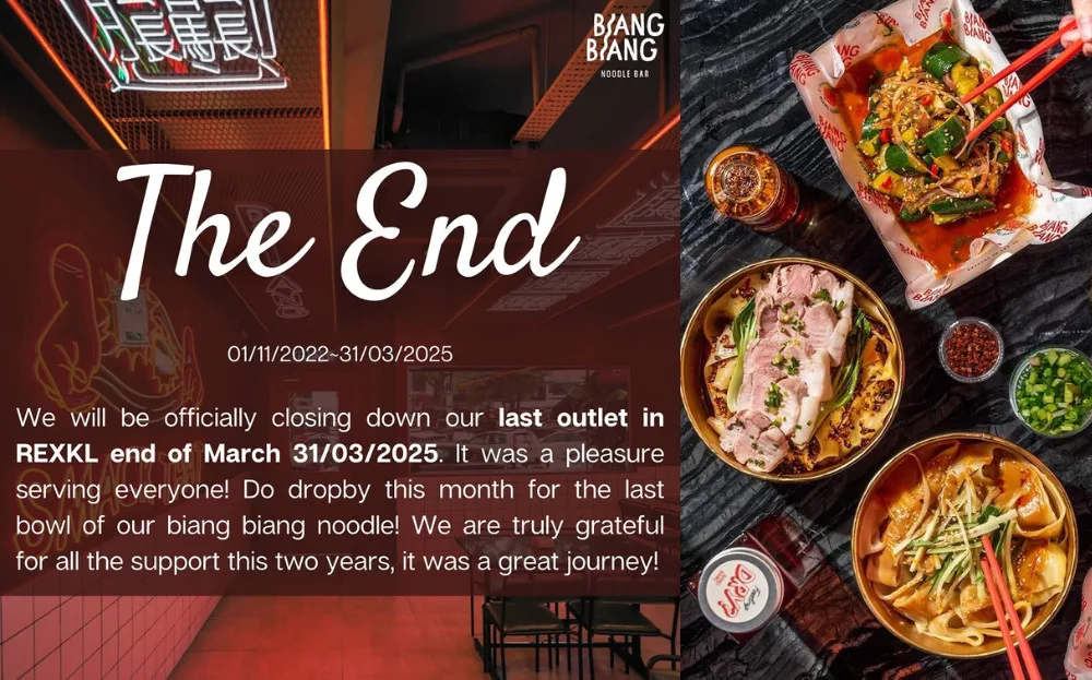 The 2023 viral hand-pulled noodle chain, Biang Biang Noodle Bar, recently announced the closure of its final outlet at REX KL. In a heartfelt Instagram post, the noodle bar revealed that it will close on 31st March 2025, marking the end of the franchise.