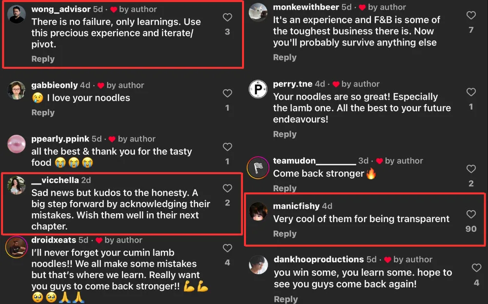 Rather than facing the regular backlash, netizens responded positively to the post, with some applauding the company’s honest approach. Instagram user (@/__vicchella) comments, “Sad news but kudos to the honesty. A big step forward by acknowledging their mistakes. Wish them well in their next chapter”. More positive comments flood Biang Biang’s Instagram post, with most encouraging the brand to come back stronger in the future.