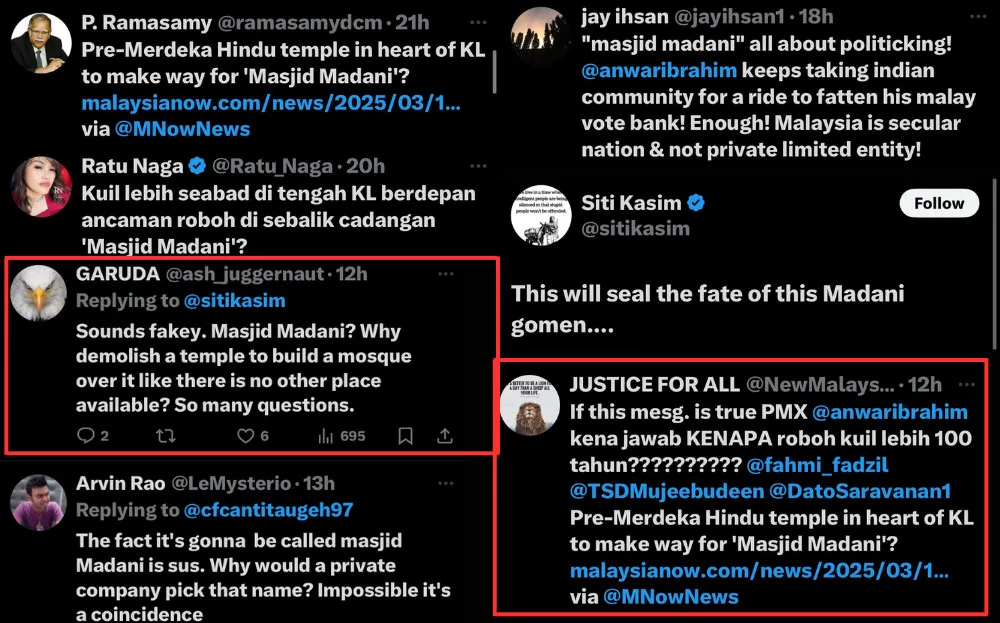 The approval for the construction of the mosque under the Kuala Lumpur City Hall (DBKL) and government bodies has sparked mass controversy among the community. Despite brewing tensions, it is reported that Prime Minister Anwar Ibrahim is expected to officiate the ceremony later this month. Netizens flood social media to express their worries and suspicions about the government’s move to demolish the temple. Twitter user (@/ash_juggernaut) comments, “Sounds fakey. Masjid Madani? Why demolish a temple to build a mosque over it like there is no other place available? So many questions”.