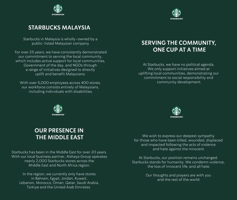 As seen in the statement above, although not explicitly, the company addressed allegations made against them regarding funding the Israeli government. “Starbucks Malaysia is wholly owned by a public-listed Malaysian company. We have no political agenda. We only support initiatives aimed at uplifting local communities, demonstrating our commitment to social responsibilities and community development,” they wrote.