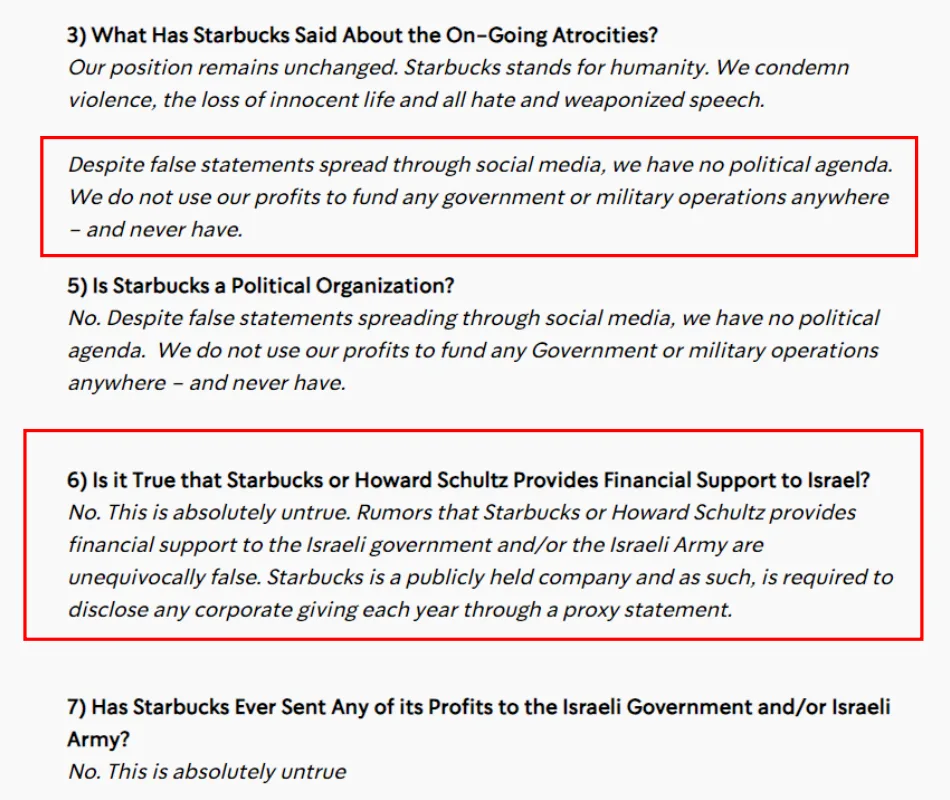 While it was not mentioned in their social posts, the brand clarified on their official website that they do not provide any funds for the Israeli government. “We do not use our profits to fund any Government or military operations anywhere – and never have. Rumours that Starbucks or Howard Schultz provides financial support to the Israeli government and/or the Israeli Army are unequivocally false.”