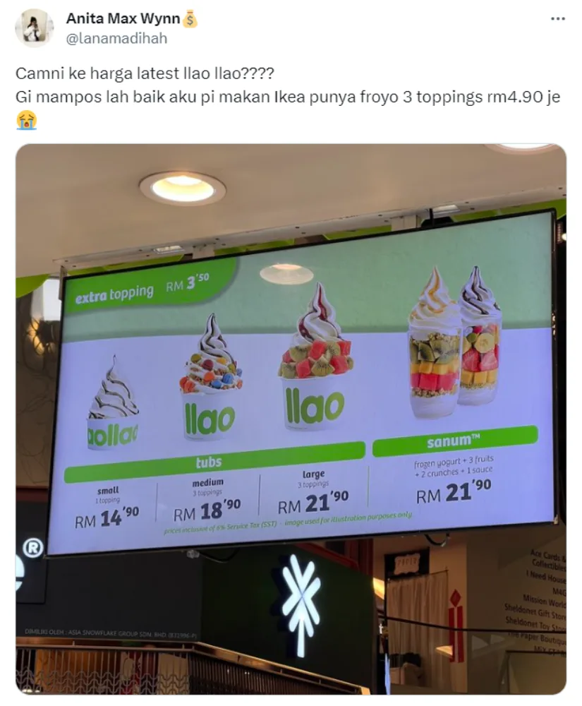 Twitter user @/lanamadinah recently shared her reaction to the new prices of a serving of frozen yoghurt from Llaollao. The tweet also included an image of the menu, showing the prices range from RM14.90 to RM21.90. In her tweet, the user wrote, “Is this the latest price for Llaollao? I’m better off eating IKEA’s frozen yoghurt. (It’s) RM4.90 for three toppings.”