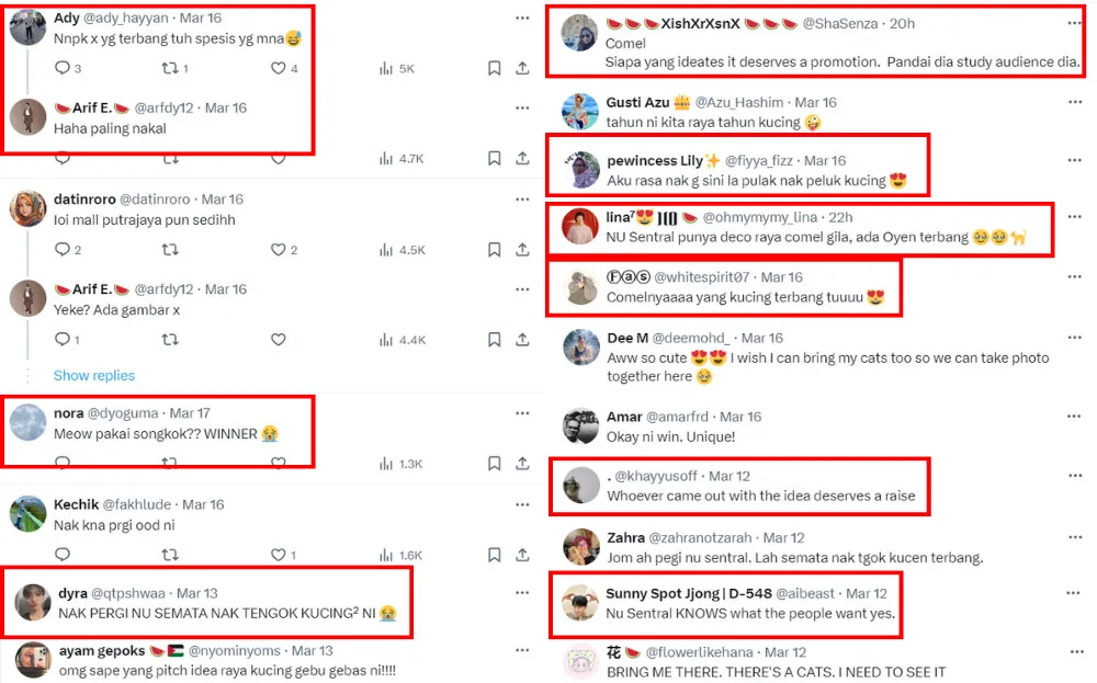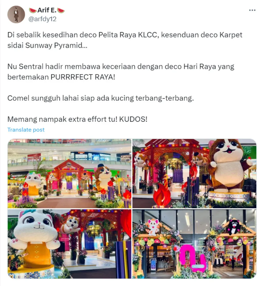 Another mall that has been receiving praise for its 2024 Raya decoration is Nu Sentral. Many netizens have shared their cat-themed decor featuring multiple cat statues displayed at the centre concourse and the mall entrances. Some of the fluffy figures even don traditional Malay attire like Baju Melayu and Songkok. Netizens love the adorable decor, saying the cats add a creative twist to the holiday. Some even joked that Nu Sentral knows how to attract cat lovers into their malls, while others say they’re tempted to bring their cats to check out the decor.