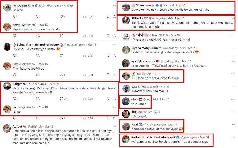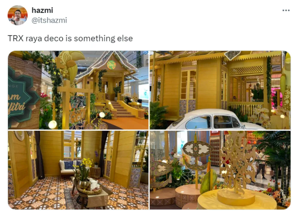 The exterior elements also feature batik motifs on some flowers and the many wau bulan. Many netizens said The Exchange TRX’s Raya decor is their favourite by far, even quipping that other malls in Kuala Lumpur should use the mall as an example. Several TikTok users have also shared videos of the traditional house structure at the mall’s centre concourse, attracting more praise for The Exchange TRX and those involved in the Raya mall decor.