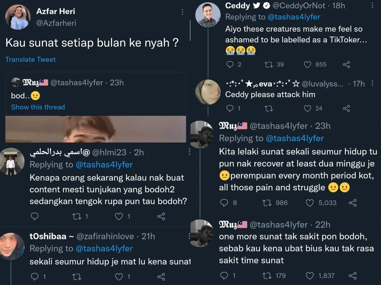 The teenager known as Adib uploaded a video on his TikTok account @adibcomell where he made a comparison of the pain of a male being circumcised with women who experience period pain on a monthly basis. The now deleted clip displayed how he was mocking and criticising the pain experienced by women during menstruation.