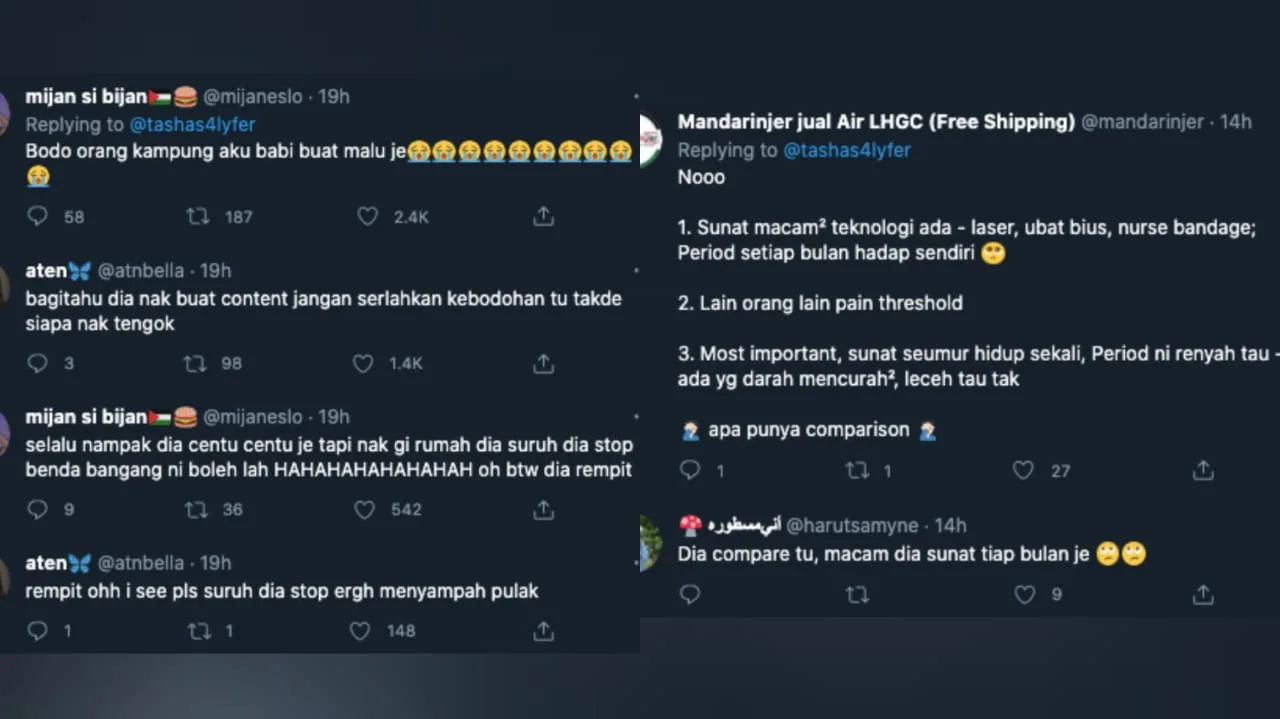 Other social media influencers including Azfar Heri and Ceddy also commented on the issue. The statement was considered by many as idiotic and attention seeking as the matter of pain between the two is unparalleled, where women experience the pain every month, while men only experience it once in a lifetime, that is, if they choose to be circumcised.