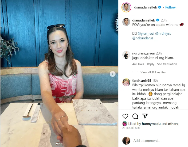 As her divorce from her ex-husband, Farid finalised just last week, many believed that Diana should not be going out or hanging out with friends out of respect for her iddah period. Some comments reminded the actress that she is still Muslim and should respect the rules of her religion. Other comments on the post included praises and compliments for the mother of two, especially about her looks.