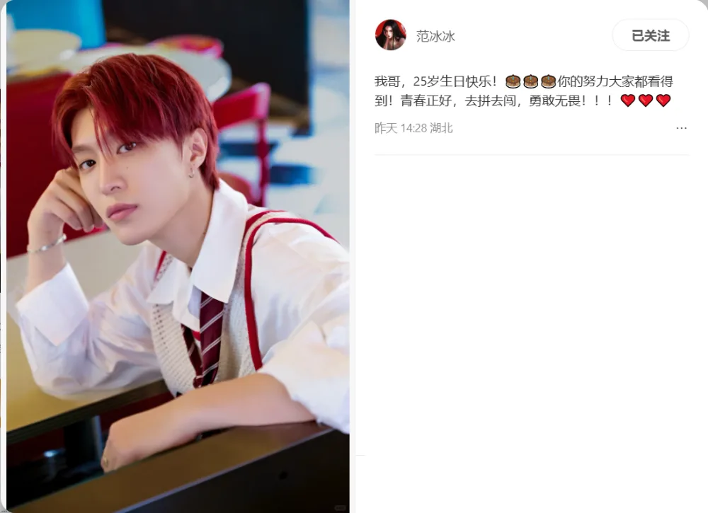 At the same time, the actress also shared a birthday message for her brother, Fan Chengcheng (范丞丞), who turned 25 years old on 16th June 2025 (Monday). Despite the large age gap, Fan Bingbing still showed affection for her sibling, writing in the captions, “My brother, happy 25th birthday! Everyone can see your hard work! Youth is the best time, so go for it! Be brave and fearless!”.