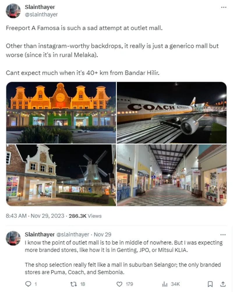 Twitter user @/Slainthayer wrote, “Freeport A’Famosa is such a sad attempt at outlet mall. Other than Instagram-worthy backdrops, it really is just a generic mall but worse (since it’s in rural Melaka). Can’t expect much when it’s 40+ km from Bandar Hilir.”