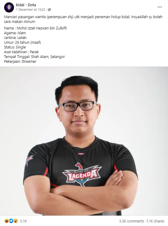 Kidal is famous for streaming his “Dota 2” gameplay as a content, but this time he got the spotlight for bravely posting his personal details in attempt to find a girlfriend via a Facebook post. Despite his honest efforts, some netizens criticised his actions due to his unorthodox way of finding a life-long partner.