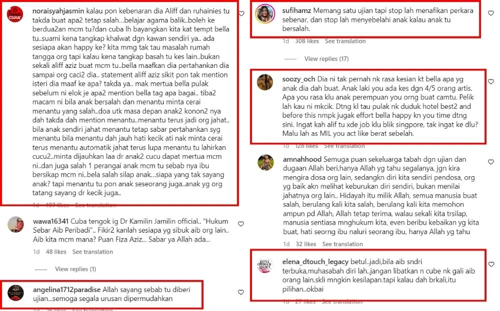Many netizens point out that Aliff has repeatedly cheated on his wife, Bella Astillah, and this incident with Ruhainies isn’t the first instance of his infidelity. Many also say that despite his multiple cheating allegations, he shows no remorse for his actions. Netizens also criticised Hafiza for seemingly denying her son’s mistakes and pushing the blame towards Bella. While some said it’s okay for a mother to support her child, some urged Hafiza not to back Aliff if he is proven guilty of khalwat.