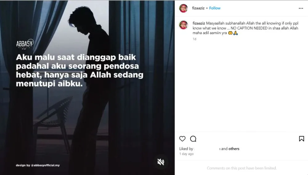 On the other hand, some netizens have shared words of support for Hafiza and her family amidst Aliff’s scandal. Meanwhile, Bella Astillah has filed for divorce from Aliff, citing his repeated infidelity as the cause. The couple previously divorced in 2019 but remarried in 2020 after a brief separation. They have two children together, 7-year-old Ayden and 4-year-old Ara.