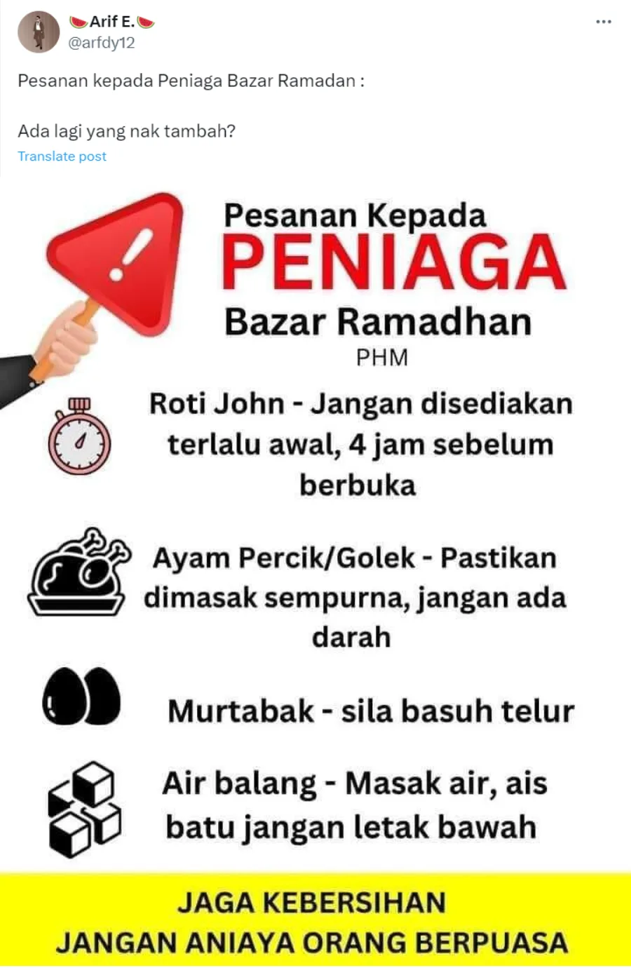 Twitter user Arif E. recently posted a “warning” for vendors planning to open stalls at this year’s Ramadan bazaar. The tweet writes, “A message to Ramadan bazaar vendors”, and includes a poster of the Twitter user’s instructions for the food sold at the bazaars. These include: