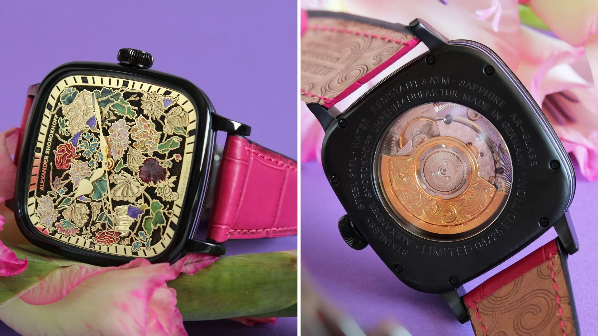The Alexander Shorokhoff Bella and Alla watch is a stunning tribute to love, designed with intricate hand-engraved floral patterns and vibrant enamel details that bring the dial to life.