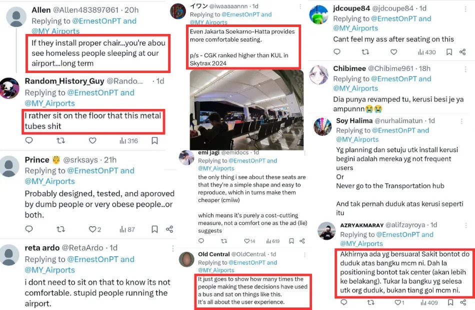 The post featured metal seats installed near the bus parking lot on Level 1 of KLIA2, designed for passengers waiting for their rides. These seats were intended to enhance comfort and provide extra space for travellers. However, despite these intentions, the choice of materials and design had led to criticism, especially since the seats are notoriously uncomfortable.