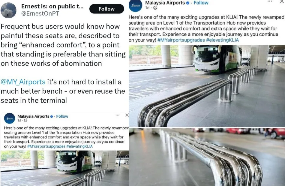 This week, a Twitter user known as @ErnestOnPT voiced dissatisfaction with the newly-revamped seating area at the Kuala Lumpur International Airport 2 (KLIA2) Transportation Hub.
