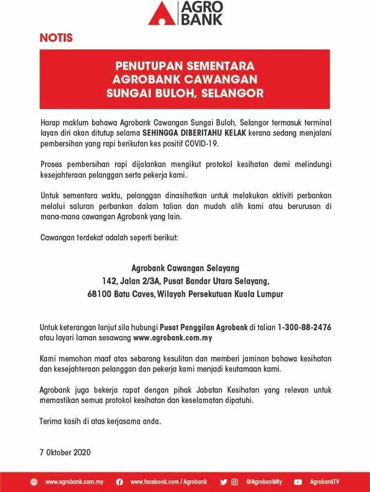 Agrobank released a statement on its website confirming that an employee from their Sungai Buloh branch has tested positive for Covid-19. According to the statement, the infected employee is currently receiving treatment at a government hospital. The bank also assured that detailed contact tracing has been carried out to identify and inform those who came into direct contact with the said employee.