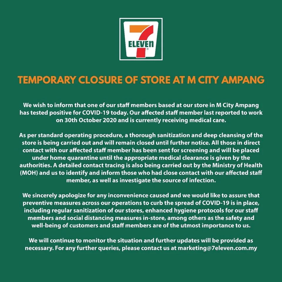 7-Eleven Malaysia has announced the temporary closure of their MCity branch back on Monday (2nd November) after a staff who was based there, tested positive for Covid-19. It is mentioned that the staff member last reported to work on 30th October and is currently receiving medical attention.