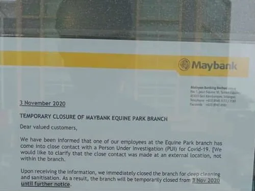 Earlier on 3rd November, Maybank released a notice regarding the temporary closure of their Equine Park branch after one of the employees had come into close contact with a Person Under Investigation (PUI) for Covid-19. The branch asserted that the contact was not made within the branch but at an external location.