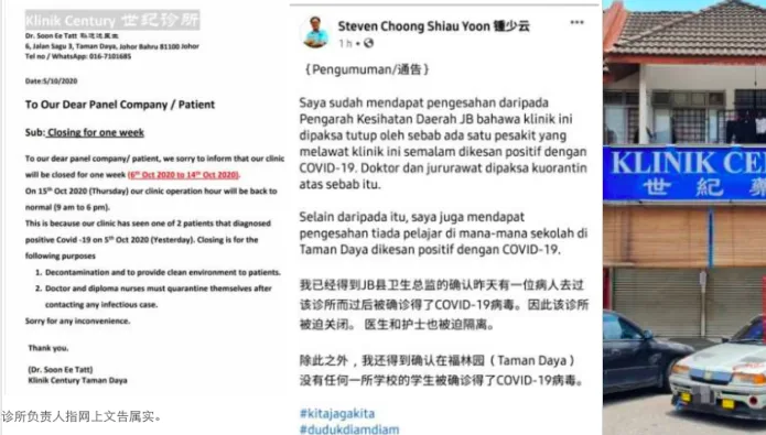 The Johor Health Department recently confirmed that 2 patients who visited Clinic Century in Taman Daya have tested positive for Covid-19. A letter from the management informed that the clinic will be closed for a week – up until 14th October.