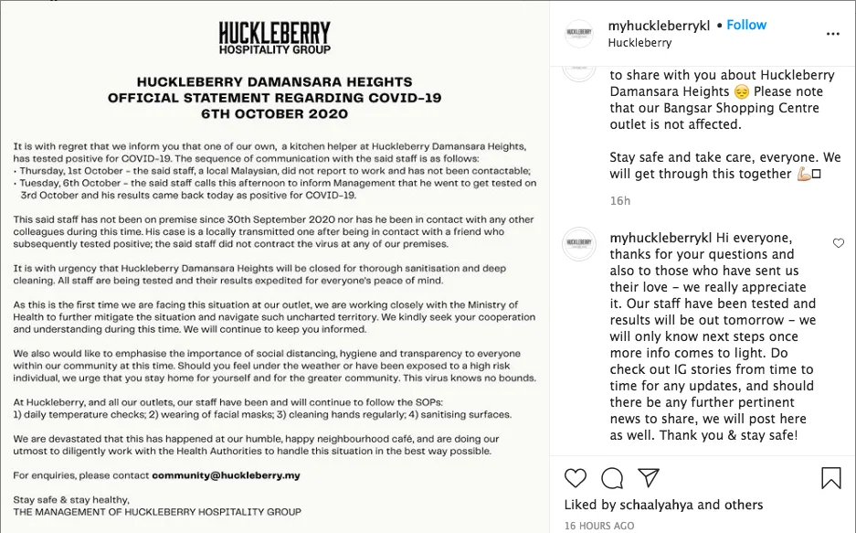 Huckleberry Hospitability Group released a statement to its patrons that a kitchen helper had tested positive for Covid-19 after failing to report for work on 1st October. “The said staff has not been on the premise since 30 September 2020, nor has he been in contact with any other colleagues during this time. His case is a locally transmitted one after being in contact with a friend who subsequently tested positive,” the management informed.
